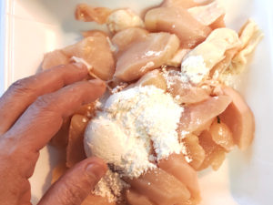 ![]() ⑤鶏肉の全面に薄く薄力粉を付けて、衣代わりにします。 |