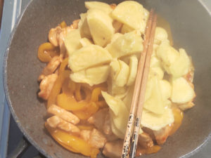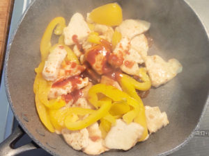 ![]() ⑦パプリカとチリソース、スイートチリソース、ケチャップをフライパンに加え、パプリカがしなっとして、全体に味が回るまで炒めます。 |