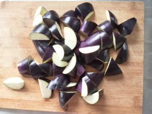 ![]() ①ナスはヘタを取り、小さめの乱切りにします。 |