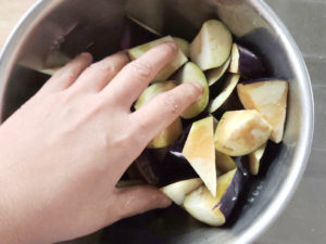 ![]() ③すぐに手でもみ返し、ナス全体に油が回るようにします。 |