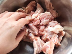 ![]() ④鶏肉は一口大にカットし、塩と黒胡椒をまぶしたら、こちらも手でよくもみこみ、下味をつけましょう。 |