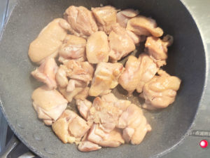 ![]() ⑤テフロン加工のフライパンに、油を引かずに鶏肉を加え、両面に焼き色がつき、白くなるまで火を通します。 |