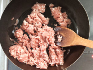 ![]() ①フライパンにごま油小1(分量外)とにんにくを入れて弱火で香りを出します。 ②香りが出たら、ひき肉が白くなり、ぽろぽろになるまで炒めましょう。 |