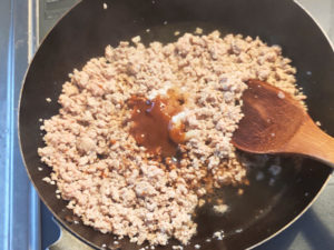 ![]() ③★ひき肉そぼろの調味料を全て加えて炒め、全体に味が回ったら、強火で炒めながら、水分を飛ばします。 |