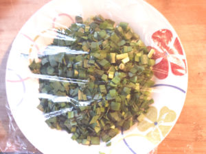 ![]() ⑤耐熱皿にニラを乗せ、ラップをしてレンジで1分半ほど加熱しておきます。 |
