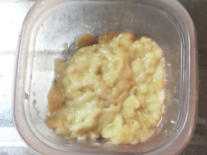 ①バナナは皮をむいて、マッシャーかフォークで細かくつぶし、レモン汁を混ぜておきます。