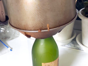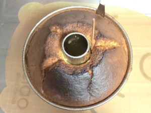 ⑫ケーキが焼けたら、すぐに逆さにして、瓶などに挿し、このまま2時間以上放置しましょう。