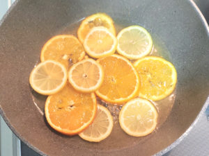 ⑬フライパンに砂糖大2と水大2(ともに分量外)を入れて溶かし、切ったオレンジとレモンの輪切りを煮ます。
