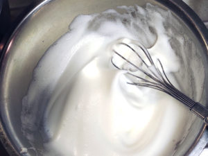 ③卵黄と卵白を別々のボールに入れ、卵白に砂糖を一つまみ加えて泡立て始め、途中二回に分けて砂糖を加え、ピンと角が立つまで泡だててメレンゲを作ります。