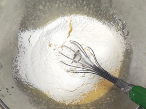 ⑧薄力粉とベーキングパウダーを合わせてふるい入れ、粉っぽさが消えるまで良く混ぜ合わせます。