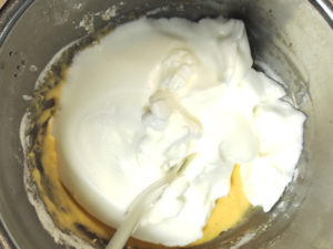 ⑨卵黄のボールにメレンゲを全量加え、ゴムべらに持ち替えて、さっくりと練らないように混ぜましょう。