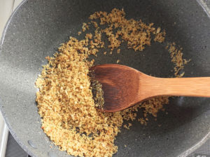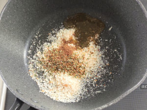 ![]() ①フライパンに、パン粉、マジックソルト、お好きなハーブ(今回はカルダモンを使用)、パン粉用オリーブオイルを入れて弱火にかけます。 |