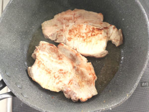 ![]() ④フライパンに豚肉用オリーブオイルを引いて豚肉を焼きはじめ、両面に焼き色を付けましょう。 |