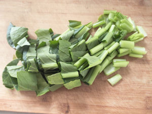 ①小松菜は根元を切り落とし、5cmくらいの幅に切ります。