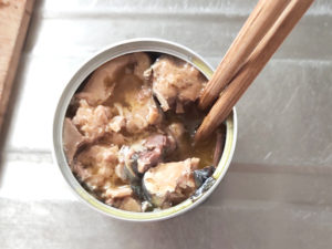 ②鯖缶は、缶に入れたまま箸でほぐしておきましょう。