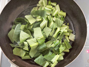 ④フライパンに薄く油(分量外)を引き、小松菜を強火でさっと1分ほど炒めます。