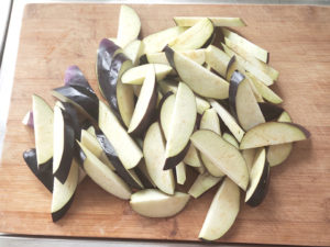 ①ナスはヘタを取り、斜め薄切りにします。
