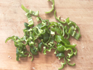 ②ピーマンは種とヘタを取り、細切りにしましょう。