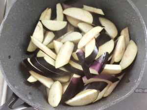 ③フライパンに半量の油を入れてナスを炒め始めます。