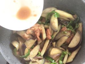 ④ナスに半ば火が通ったら、残りの油を回しかけ、ナスがくたっとするまで火を通しましょう。