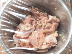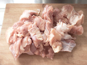 ![]() ①鶏肉は、大きめの一口大に切ります。 |