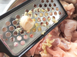 ![]() ③ボールに肉をいれ、上からにんにくをすりおろして加えます。 |