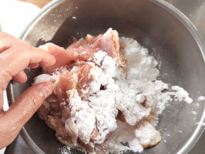 ![]() ⑥肉に片栗粉を薄くまぶしておきましょう。 |