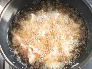 ![]() ⑦180~190度の油で、肉が軽く色づくまで揚げます。 (片面4分ずつくらいで、裏返すと良いと思います。) |