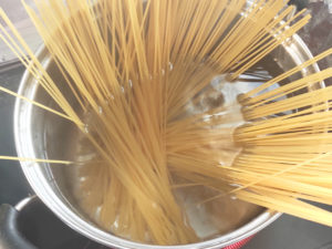 ![]() ①鍋にたっぷりのお湯を沸かし、パスタをパッケージの表示通りの時間でゆでます。 |