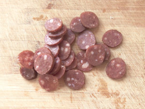 ![]() ②サラミは、薄い輪切りにしましょう。 |