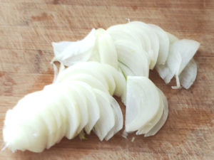 ![]() ③玉ねぎは皮をむき、薄切りにします。 |