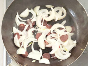 ![]() ④フライパンに薄く油(分量外)を引き、玉ねぎとサラミを加えて、玉ねぎがしんなりするまで炒めましょう。 |