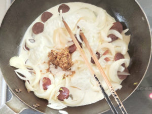 ![]() ⑤生クリームと粒マスタード、コンソメを加えて混ぜ、沸騰させます。 |