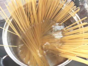 ②鍋にたっぷりのお湯を沸かし、塩を大1/2(分量外)ほど加え、パスタをパッケージの表示時間通りにゆでましょう。