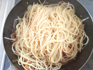 ⑤ゆでたパスタも投入し、火を止めてから、全体に味が絡むように大きく混ぜ合わせます。