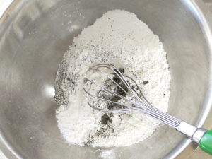 ①ボールに、米粉、蓬粉末、砂糖、ベーキングパウダーを入れて、良く混ぜ合わせます。