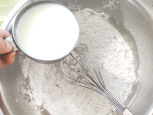 ②牛乳を2回に分けてボールに加え、粉が見えなくなるまで、しっかり目に混ぜましょう。