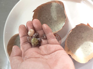 ⑤甘納豆を生地を入れた型に等分になるように入れましょう。
