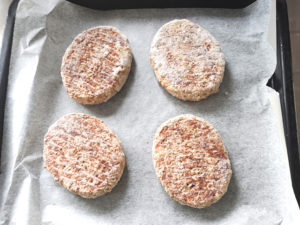![]() ①オーブン用の天板に、オーブンシートを敷き、冷凍ハンバーグを冷凍のまま乗せます。 |
