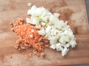 ![]() ②玉ねぎと人参は皮をむき、粗みじん切りにします。 |