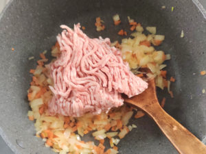 ![]() ④ひき肉も投入し、肉がポロポロになるまで炒めます。 |