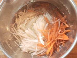 ![]() ⑦大根とサラダ用人参は皮をむいて、細切りにします。 ⑧切ったら、水に放ち、2分ほど置いたら、しっかりと水気を切りましょう。 |