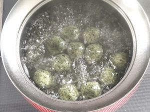 ⑤小鍋にお湯を沸かし、沸いたら団子を入れてゆでましょう。