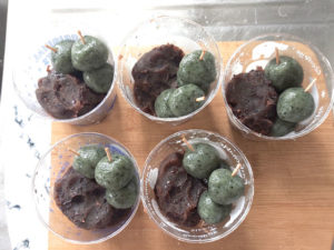 ⑧爪楊枝に団子を2個ずつ刺し、透明なカップ(100均を使用)に団子と餡子を等分に入れます。