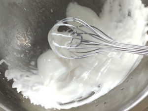 ⑨ボールに生クリームとクリーム用砂糖を入れ、8分立てくらいのちょっと固めのクリームを作りましょう。