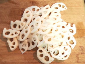 ![]() ②水煮のレンコンは、薄い半月切りにしましょう。 |