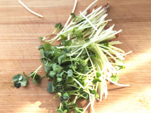 ②貝割れは根元を落とし、半分の長さに切ったら、切り干し大根のボールに入れましょう。