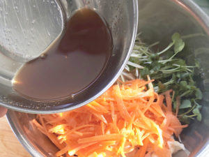 ⑦野菜が入ったボールに、混ぜ合わせたドレッシングを加え、全体をよく混ぜ合わせましょう。