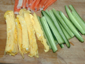 ![]() ②卵は砂糖を加えて、厚焼き玉子を作り、その後、棒状にカットし、きゅうりも棒状にカットします。 |