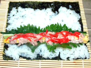 ![]() ⑤巻きすの上に海苔を乗せ、酢飯を240gほど乗せます。 ⑥海苔の向こう側を2cmほど残し、酢飯を均等の厚さになるように広げましょう。 ⑦手前に、シソ、卵焼き、ツナマヨ、きゅうり、紅生姜を乗せる。 |